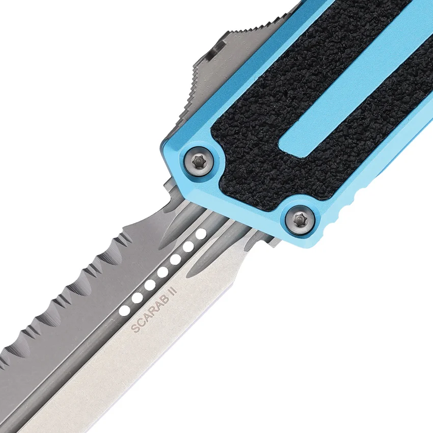 Automatic opening. 5.75″ (14.61cm) closed. 3.9″ (9.91cm) stonewash finish serrated Bohler M390MK stainless dagger blade. Turquoise aluminum handle with black traction insert. Glass breaker. Lanyard hole. Pocket clip. Boxed.
