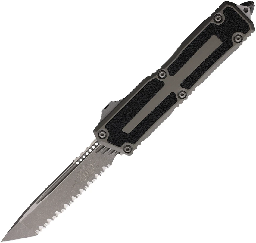 Automatic opening. 5.75″ (14.61cm) closed. 3.9″ (9.91cm) Apocalyptic finish serrated Bohler M390MK stainless tanto blade. Gray aluminum handle with black traction insert. Glass breaker. Lanyard hole. Pocket clip. Boxed.