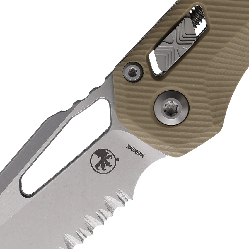 5″ (12.7cm) closed. 3.75″ (9.53cm) stonewash finish partially serrated Bohler M390MK stainless sheepsfoot blade. Tan G10 handle. Thumb pull. Lanyard hole. Pocket clip. Boxed.