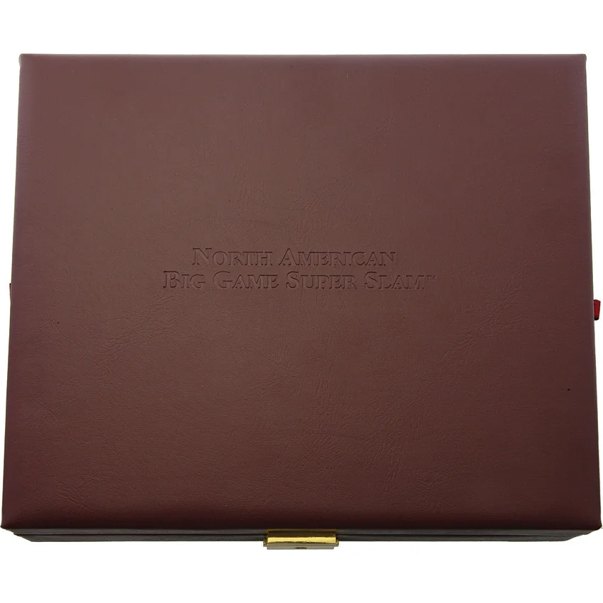 Brown faux leather box measures 11″ x 9.5″ x 2″. Locking brass clasp with key. Formed inserts hold 28 coins. Boxed.