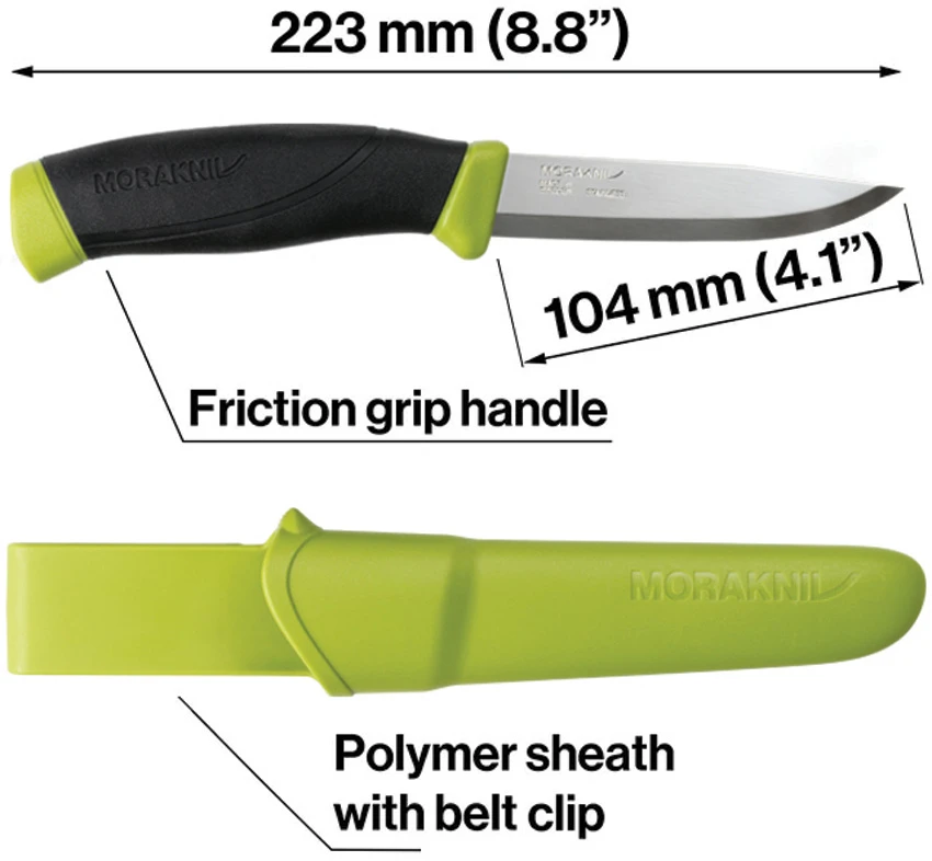 8.75″ (22.23cm) overall. 4″ (10.16cm) satin finish Scandi grind stainless blade. Black and green polymer handle. Green polymer belt sheath. Bulk packed.