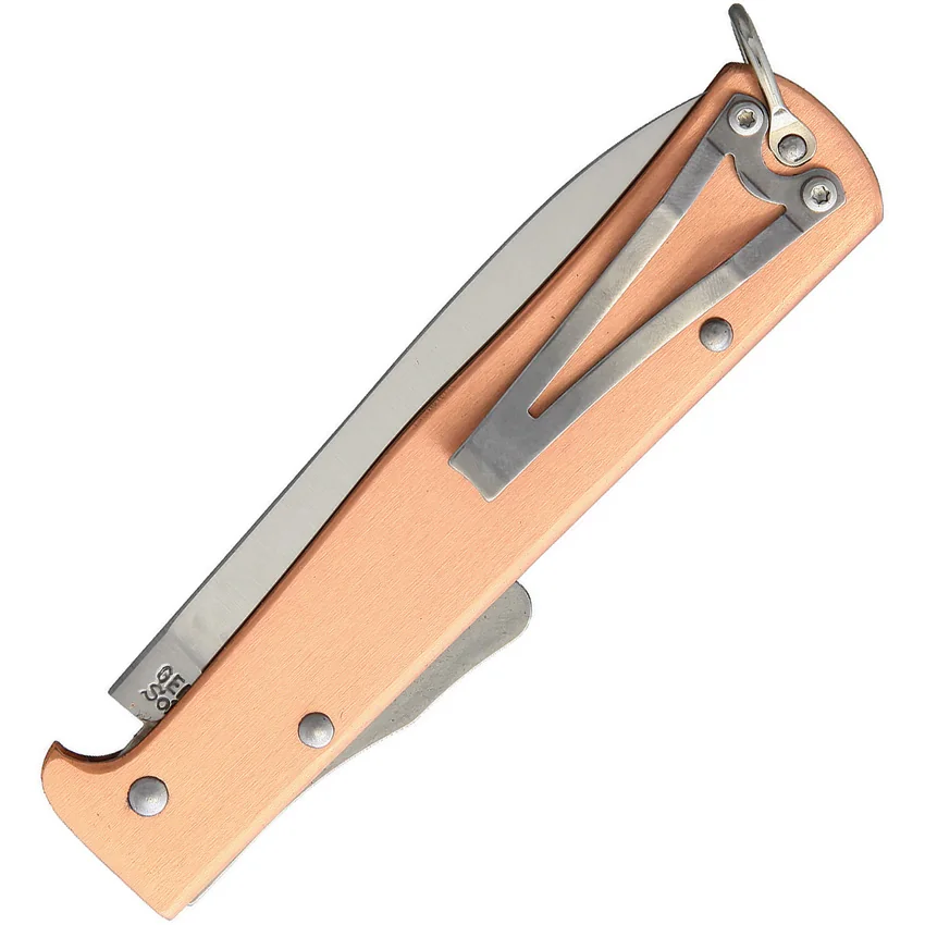 4.25″ (10.8cm) closed. 3.5″ (8.89cm) satin finish stainless blade. Copper handle. Bail. Hang packaged.