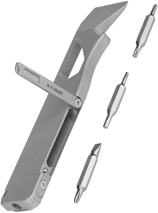 Tools include: Pry bar l Small screwdriver l Bottle opener l Hex/Bit driver l Ruler. Titanium construction. Boxed.
