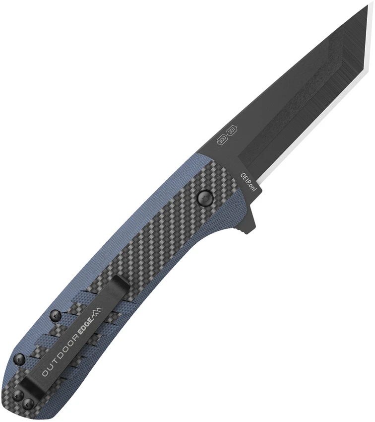 4.5″ (11.43cm) closed. 3″ (7.62cm) 420J2 stainless blade. Blue G10 handle with carbon fiber inlay. Pocket clip. Extended tang. Black oxide coated stainless blade holder. Push button blade changes. Blades included: (1) Tanto; (2) Standard edge drop point; (1) Serrated drop point. Clam packed.