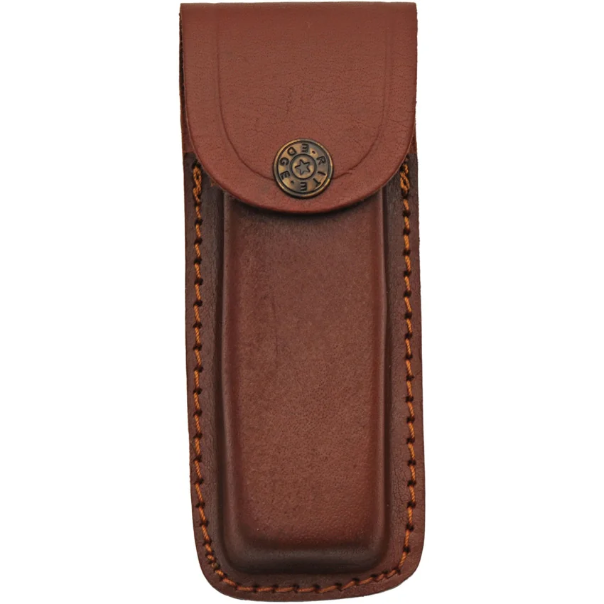 5″ (12.7cm) closed. 4″ (10.16cm) satin finish stainless clip point blade. Orange pakkawood handle. Stainless bolster(s). Lanyard hole. Brown leather belt sheath. Boxed.