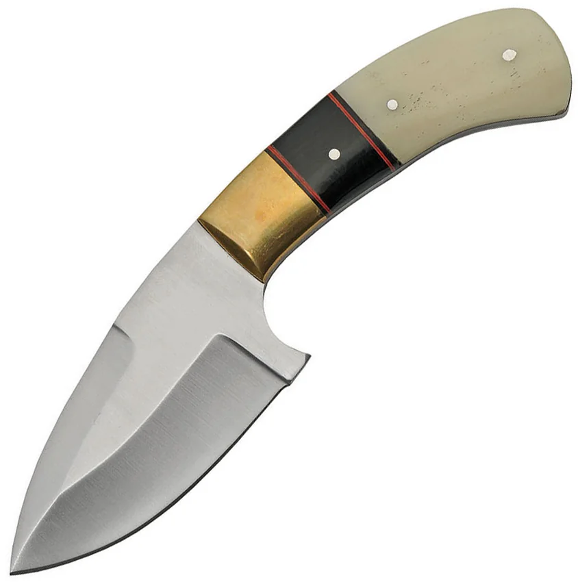 7″ (17.78cm) overall. 3.5″ (8.89cm) satin finish stainless blade. Bone handle. Brass bolster(s). Full tang. Horn handle spacer. Brown leather belt sheath. Boxed.