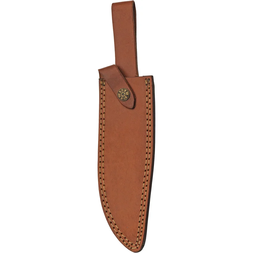 12.5″ (31.75cm) overall. 7.25″ (18.42cm) satin finish stainless blade. Brass guard and pommel. Green pakkawood and burnt bone handle. Brown leather belt sheath. Boxed.