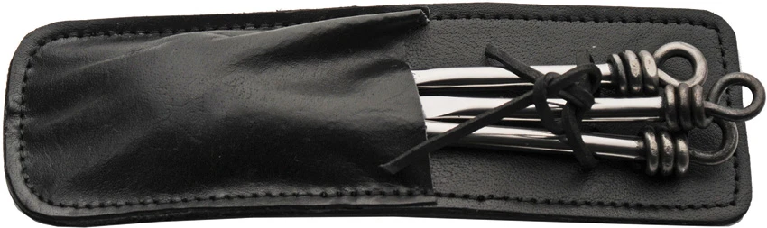8″ overall. Three piece set. Spoon, fork, and knife. Black leather pouch. High carbon stainless construction. Boxed.