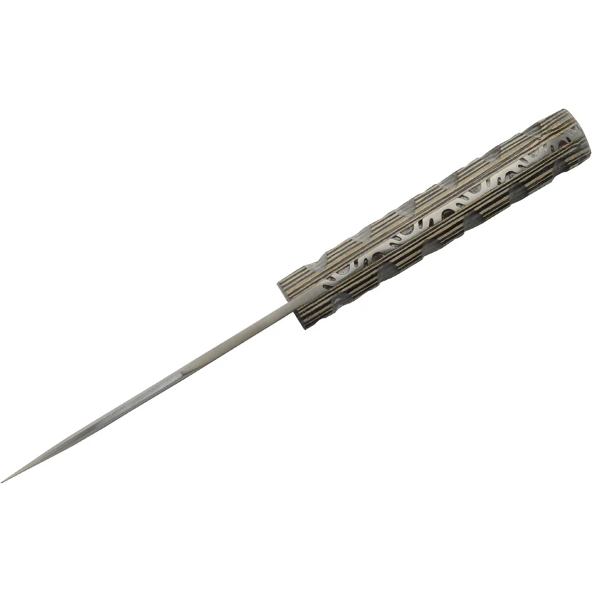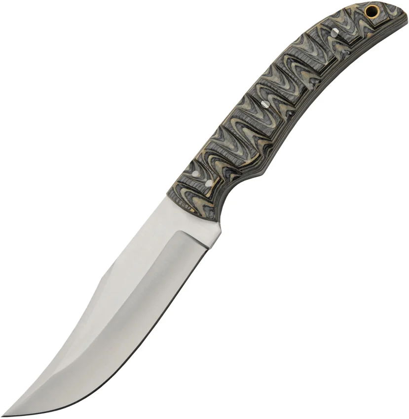 9.5″ (24.13cm) overall. 4.5″ (11.43cm) satin finish stainless upswept blade. Gray sculpted wood handle. Full tang. Lanyard hole. Brown leather belt sheath. Boxed.