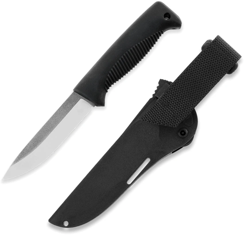 9.63″ (24.46cm) overall. 4.63″ (11.76cm) satin finish Bohler N690 stainless blade. Black TPE handle. Lanyard hole. Black composite MOLLE compatible belt sheath. Boxed with hanging tab.