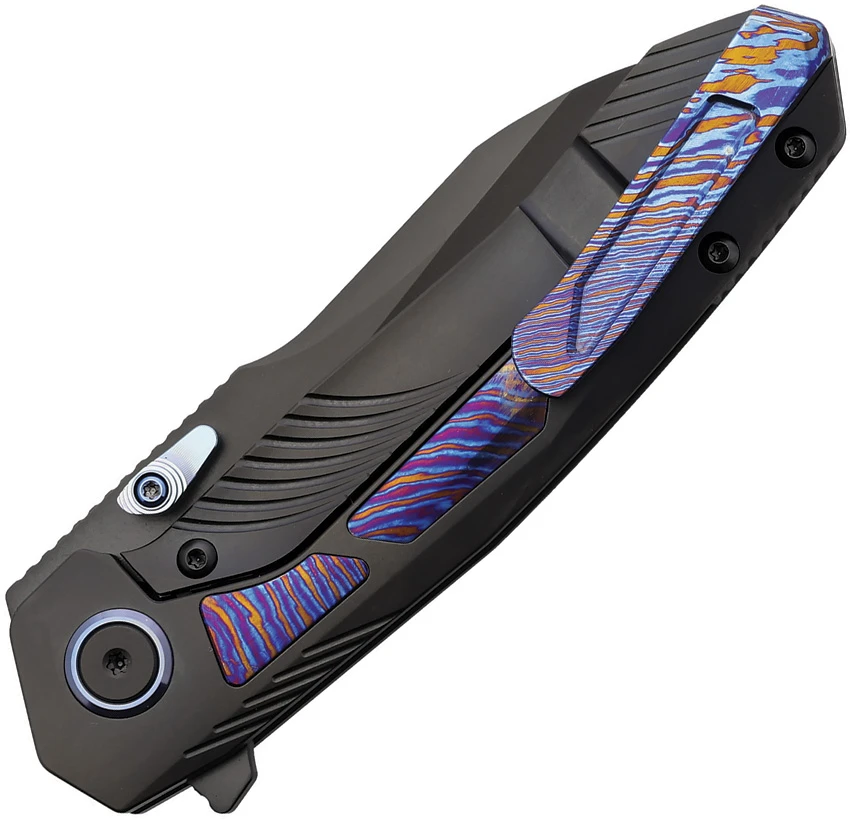 4.25″ (10.8cm) closed. 3.25″ (8.26cm) black DLC coated S35VN stainless reverse tanto blade. Black DLC coated titanium handle with Timascus inlay. Thumb stud. Extended tang. Pocket clip. Black nylon zippered storage case. Boxed.