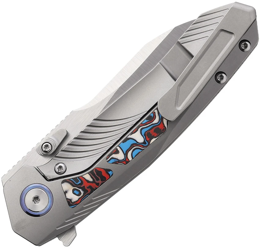 4.25″ (10.8cm) closed. 3.25″ (8.26cm) satin finish Bohler M390 stainless reverse tanto blade. Gray titanium handle with Red, white, and blue carbon fiber inlay. Extended tang. Thumb stud. Pocket clip. Lanyard hole. Black nylon zippered storage case. Boxed.