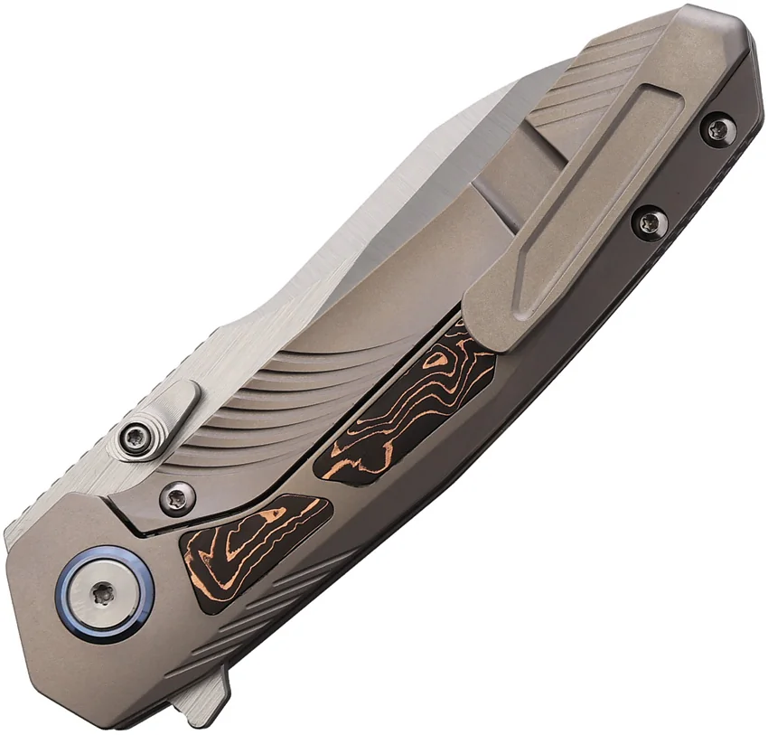 4.25″ (10.8cm) closed. 3.25″ (8.26cm) satin finish S35VN stainless blade. Gray titanium handle with Copper foil carbon fiber inlay. Extended tang. Thumb stud. Pocket clip. Lanyard hole. Black nylon zippered storage case. Boxed.