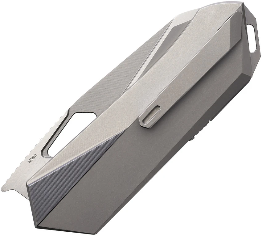 4.25″ (10.8cm) closed. 3″ (7.62cm) bead blast finish Bohler M390 stainless blade. Gray titanium handle. Extended tang. Thumb pull. Lanyard hole. Pocket clip. Black nylon zippered storage case. Boxed.