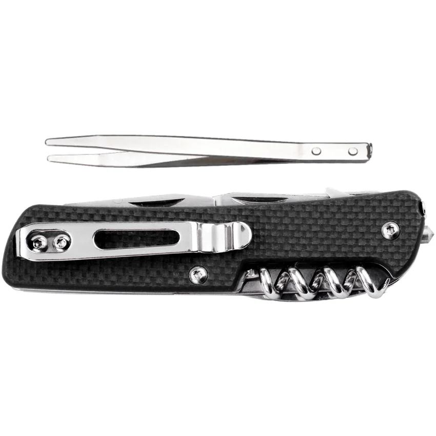 3.75″ (9.53cm) closed. 12C27 Sandvik stainless blade. Black G10 handle. Tools include: Large blade l Glass breaker l Pocket clip l Tweezers l Bottle opener l Corkscrew l Large screwdriver l Wire stripper l Belt/cord cutter l Small screwdriver l Keyring l Scissors l Reamer with sewing eye l Pliers l Wire cutter l Saw blade I Drill I Facer I Fishing line pliers. Boxed.