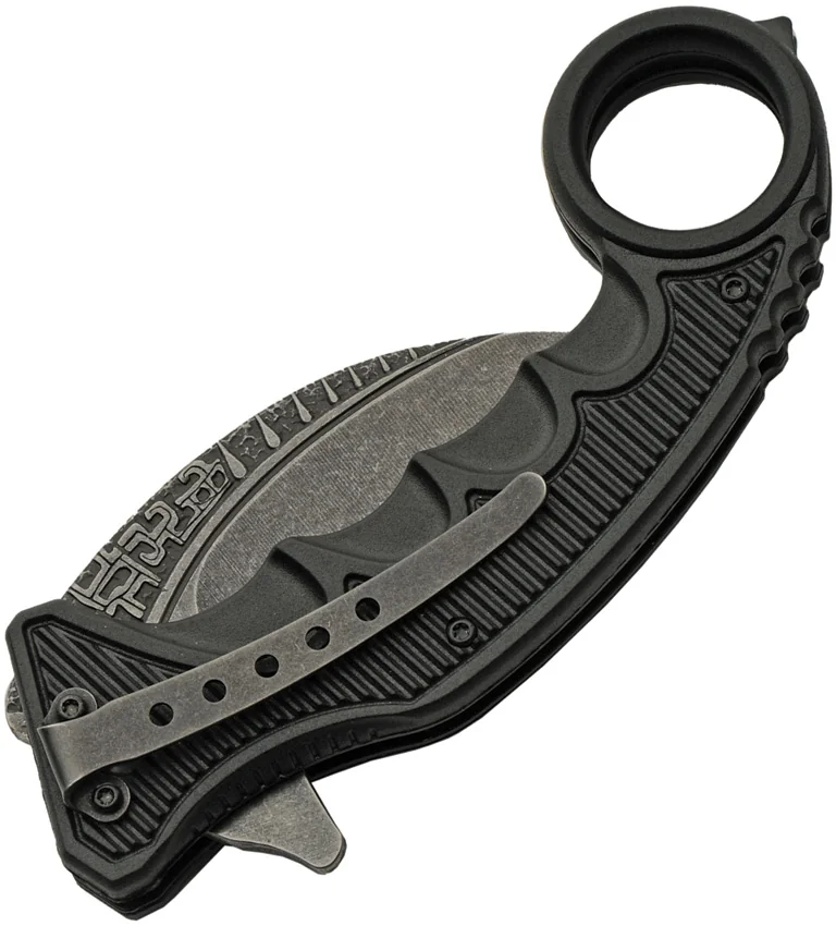 Assisted opening. 5.75″ (14.61cm) closed. 3.25″ (8.26cm) black stonewash finish 3Cr13 stainless karambit blade. Black ABS handle with Spectrum stainless onlay. Extended tang. Finger ring. Pocket clip. Glass breaker. Boxed.