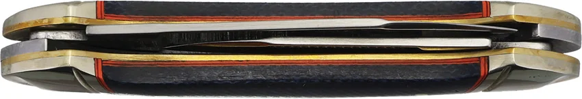 Faded Blue Jeans. 2.75″ (6.99cm) closed. Satin finish stainless spear and pen blades. Denim micarta handle. Nickel silver bolster(s). Inlay shield. Orange liners. Boxed.