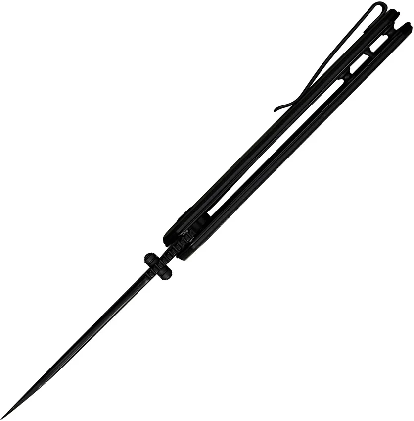 5″ (12.7cm) closed. 3.75″ (9.53cm) black finish 9Cr18MoV stainless sheepsfoot blade. Black and green G10 handle. Extended tang. Thumb stud. Pocket clip. Black nylon zippered storage case. Boxed.