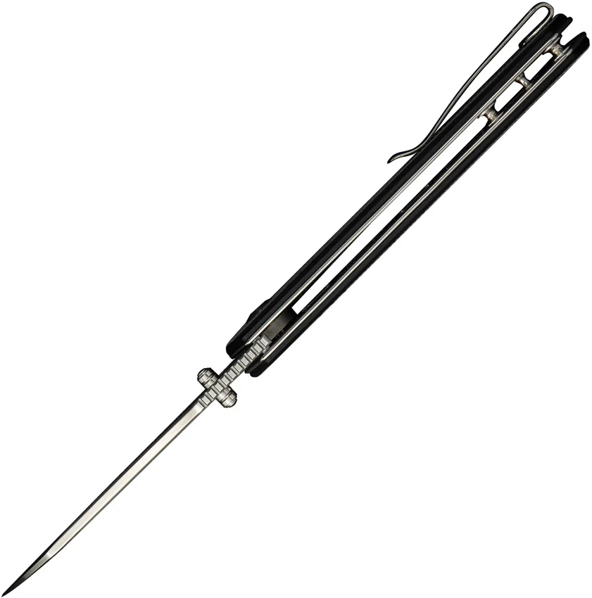 5″ (12.7cm) closed. 3.75″ (9.53cm) satin finish 9Cr18MoV stainless sheepsfoot blade. Black and gray G10 handle. Extended tang. Thumb stud. Pocket clip. Black nylon zippered storage case. Boxed.