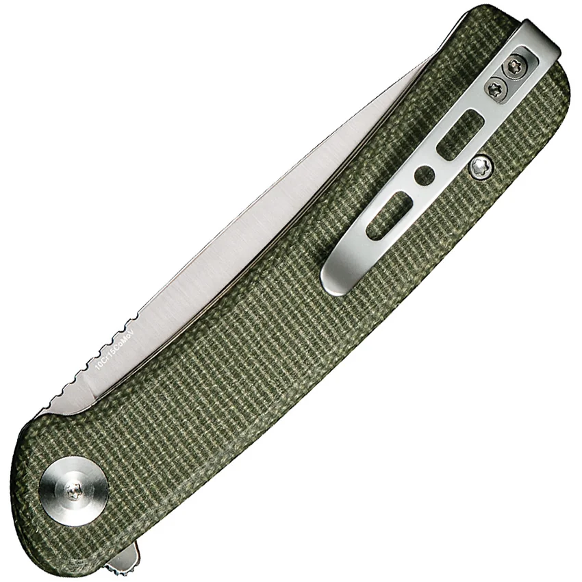 4.25″ (10.8cm) closed. 3.25″ (8.26cm) satin finish 10Cr15CoMoV stainless drop point blade. Green micarta handle. Extended tang. Pocket clip. Black nylon zippered storage case. Boxed.