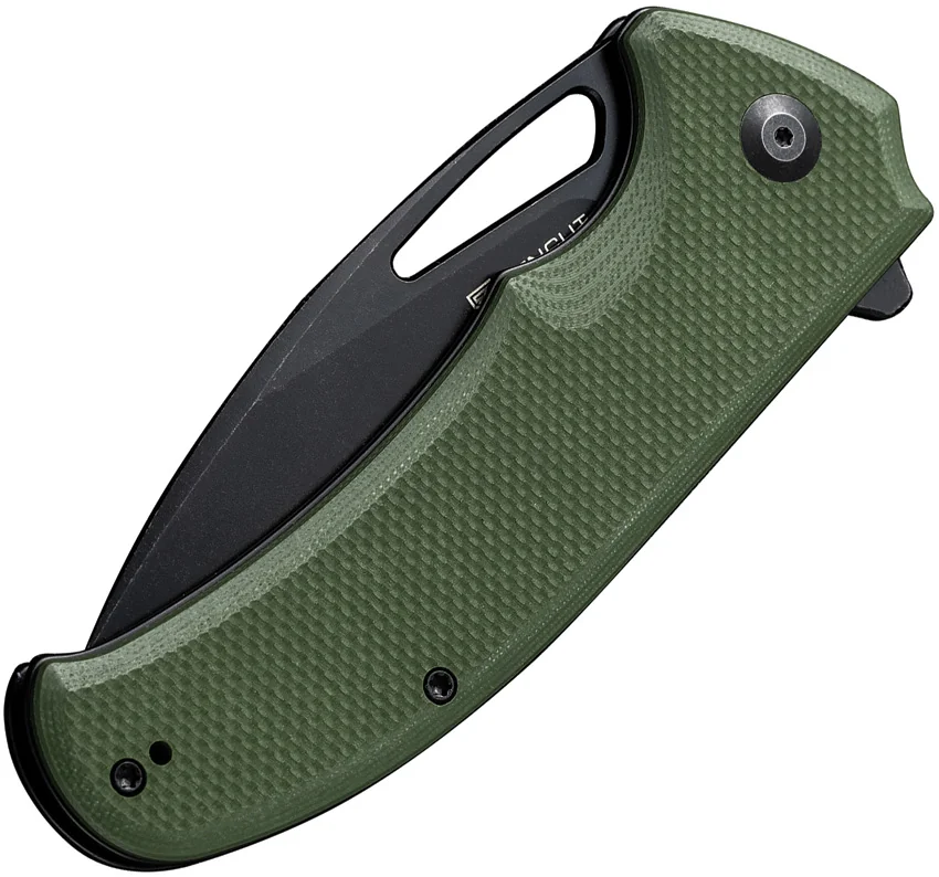 5″ (12.7cm) closed. 3.75″ (9.53cm) black stonewash finish 9Cr18MoV stainless drop point blade. OD green G10 handle. Extended tang. Thumb pull. Pocket clip. Black nylon zippered storage case. Boxed.