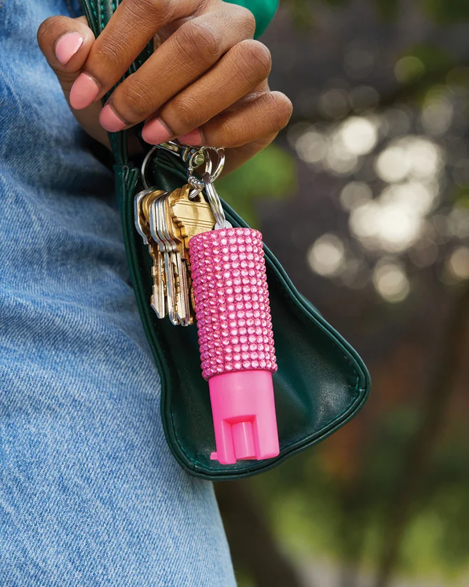 3.5″ overall. Attachment clip. 25 bursts. 10 ft power stream pattern. Twist lock safety. Jeweled monochromatic design. Color: Pink. Clam packed. ORM-D item.