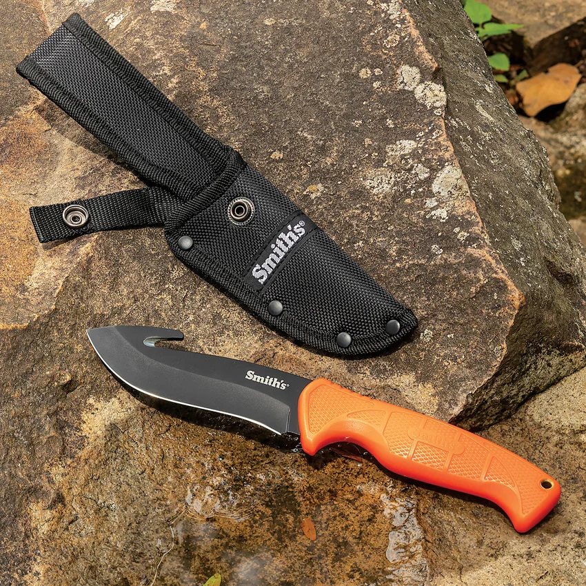 8.63″ (21.92cm) overall. 4″ (10.16cm) black oxide coated 420 stainless guthook blade. Orange textured TPE handle. Lanyard hole. Includes sharpener with carbide and ceramic rods, hook sharpening grooves, line cutter, and non-slip feet. Black nylon belt sheath. Clam packed.