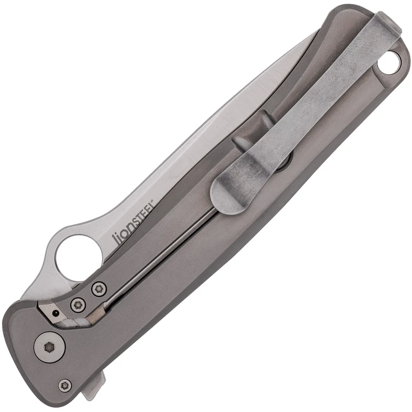 4.38″ (11.13cm) closed. 3.38″ (8.59cm) satin finish Bohler M390 stainless blade. Gray titanium handle with carbon fiber inlay. Thumb pull. Extended tang. Lanyard hole. Pocket clip. Boxed.
