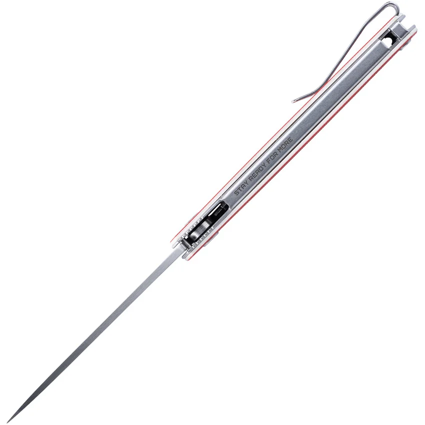 4.13″ (10.49cm) closed. 3.13″ (7.95cm) satin finish 12C27 Sandvik stainless blade. Red and white G10 handle. Extended tang. Pocket clip. Boxed.