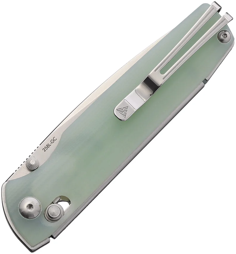 4.5″ (11.43cm) closed. 3.5″ (8.89cm) stonewash finish D2 tool steel blade. Jade G10 handle. Thumb stud. Pocket clip. Boxed.