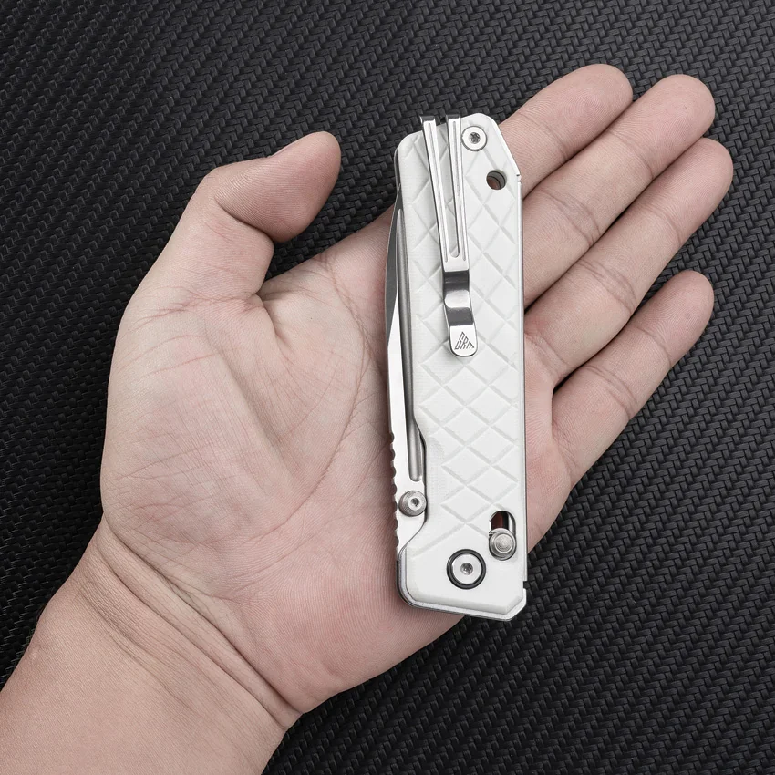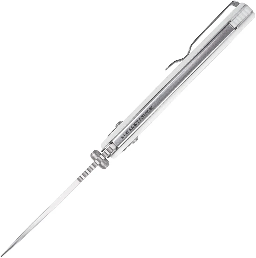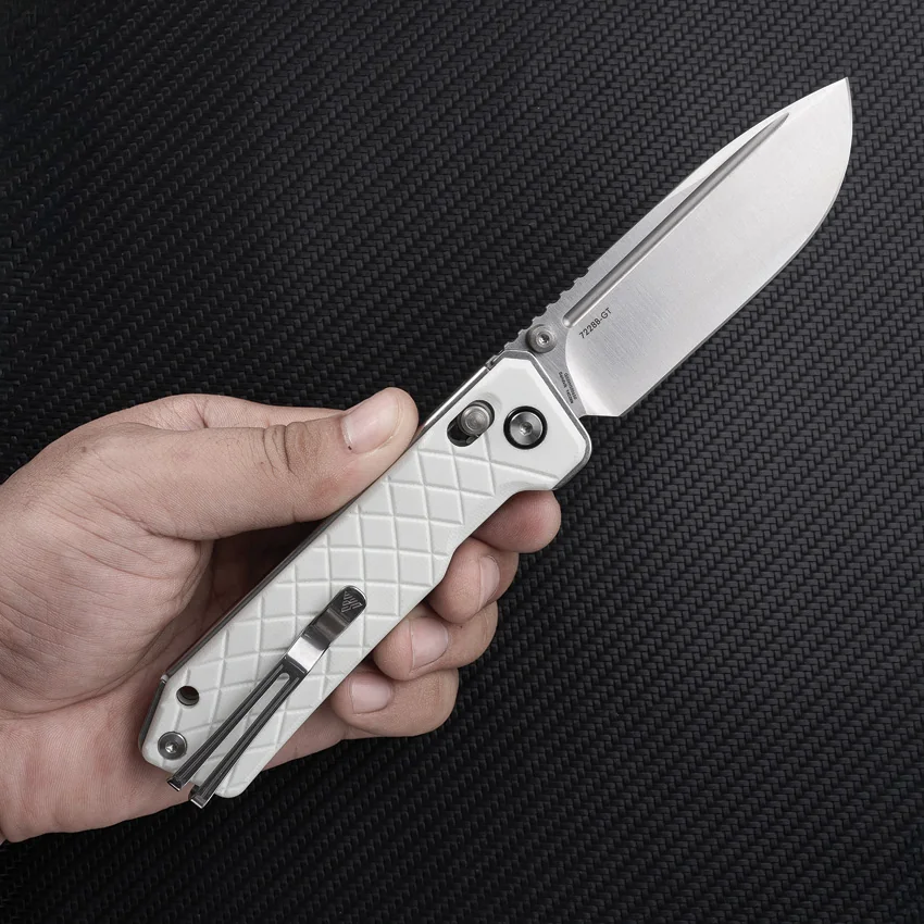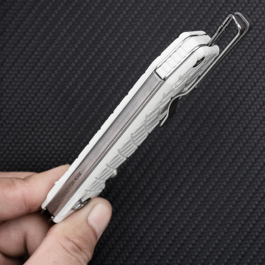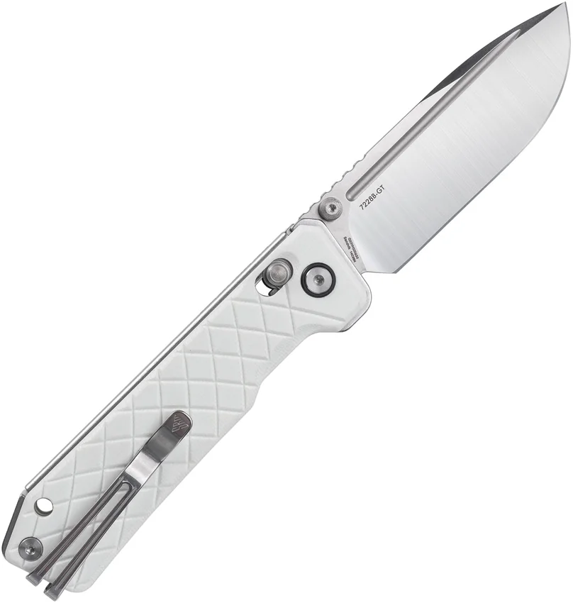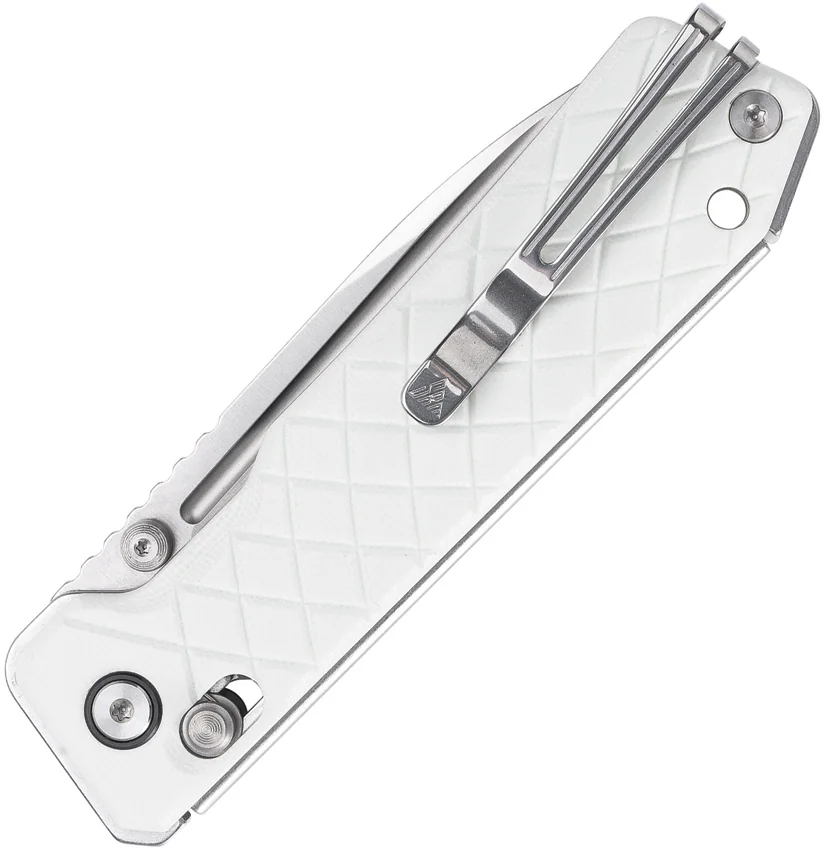 4.5″ (11.43cm) closed. 3.5″ (8.89cm) satin finish 14C28N Sandvik stainless blade. White textured G10 handle. Thumb stud. Lanyard hole. Pocket clip. Boxed.