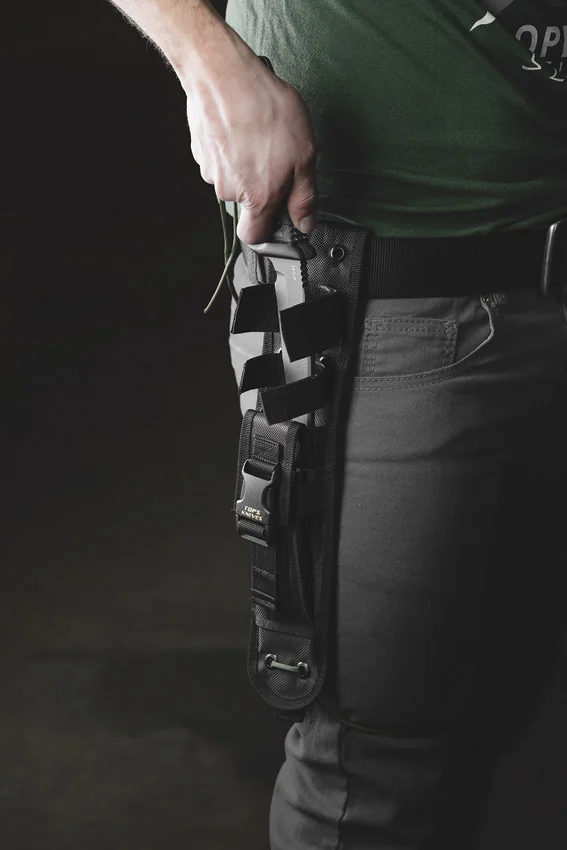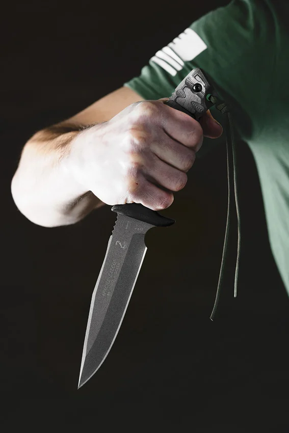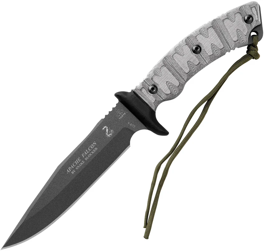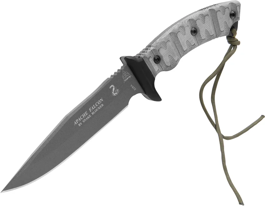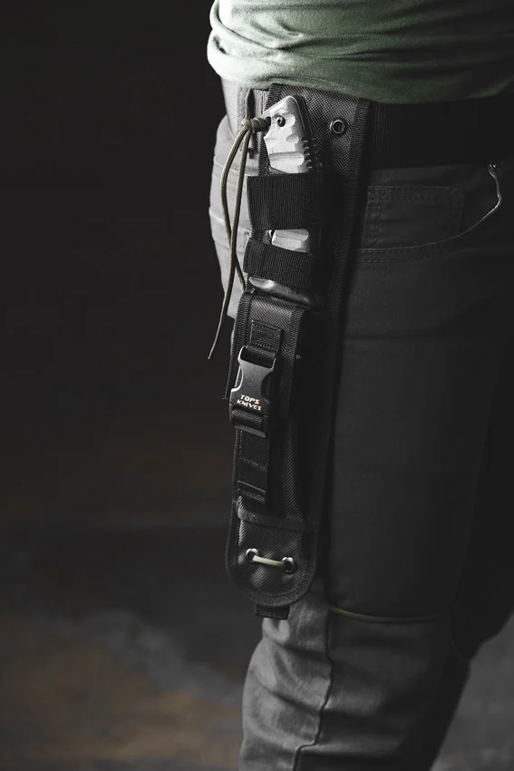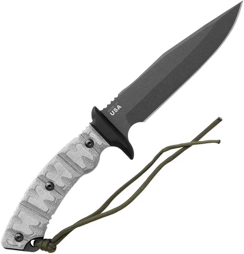 12″ overall. 6 1/4″ 1095 high carbon steel blade with bead blast finish. Full tang. Black linen micarta handles with Rocky Mountain tread grip. Lanyard. Black ballistic nylon belt sheath with Kydex liner and lanyard.