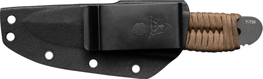 6 3/4″ overall. 3″ blade. One piece 1095 high carbon steel construction with tactical gray finish. Desert tan paracord wrapped handle. Molded black Kydex sheath with belt clip. Packaged with TOPS emergency whistle.