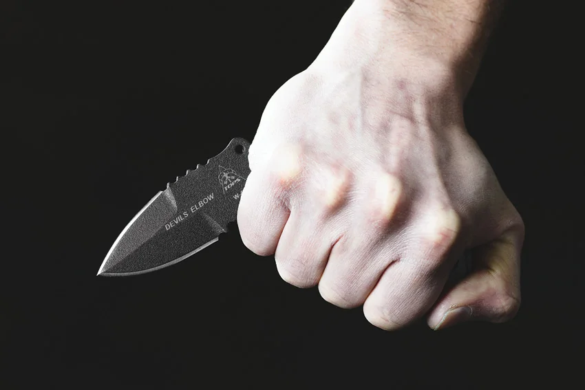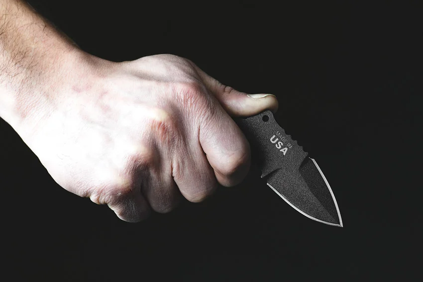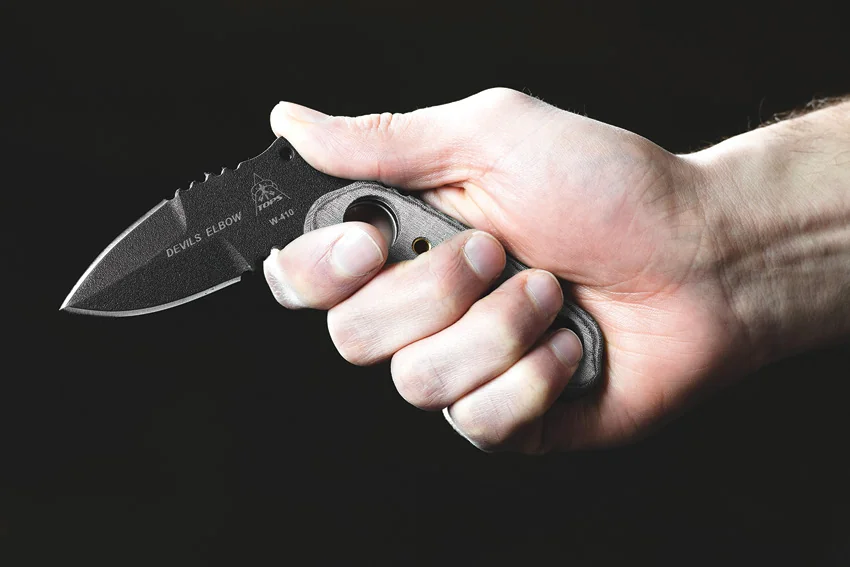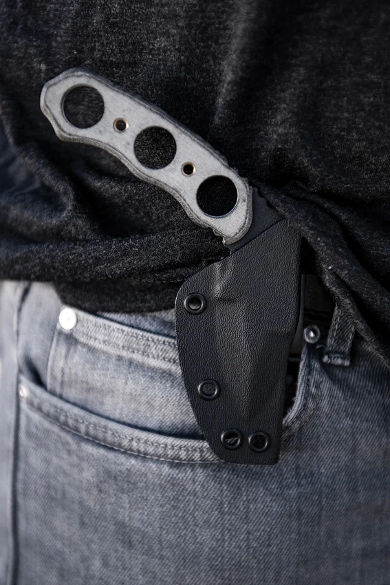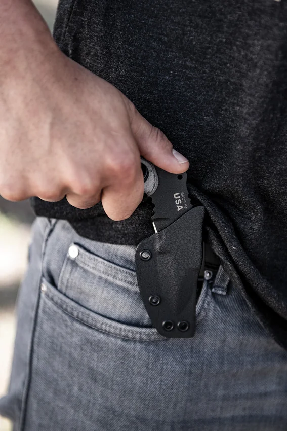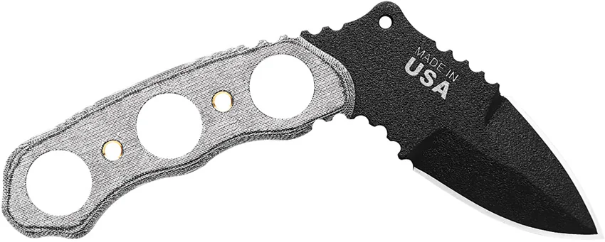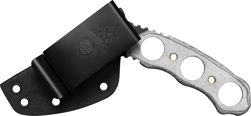 6″ overall. 3 1/4″ 1095 high carbon stainless spear point blade with black traction coating. Blade is angled with a 2 1/8″ bottom cutting edge and 1 3/4″ top cutting edge. Full tang. Black micarta handles with machined hole cutouts. Black Kydex belt sheath.