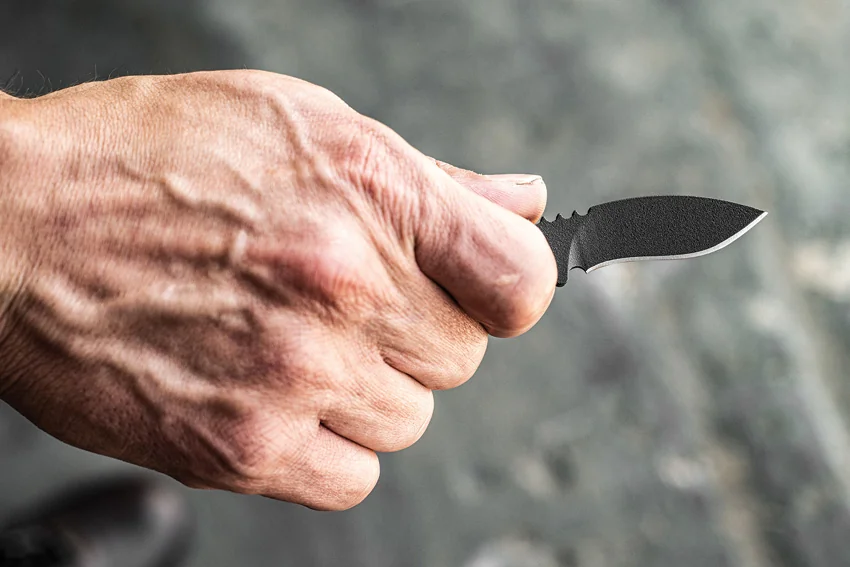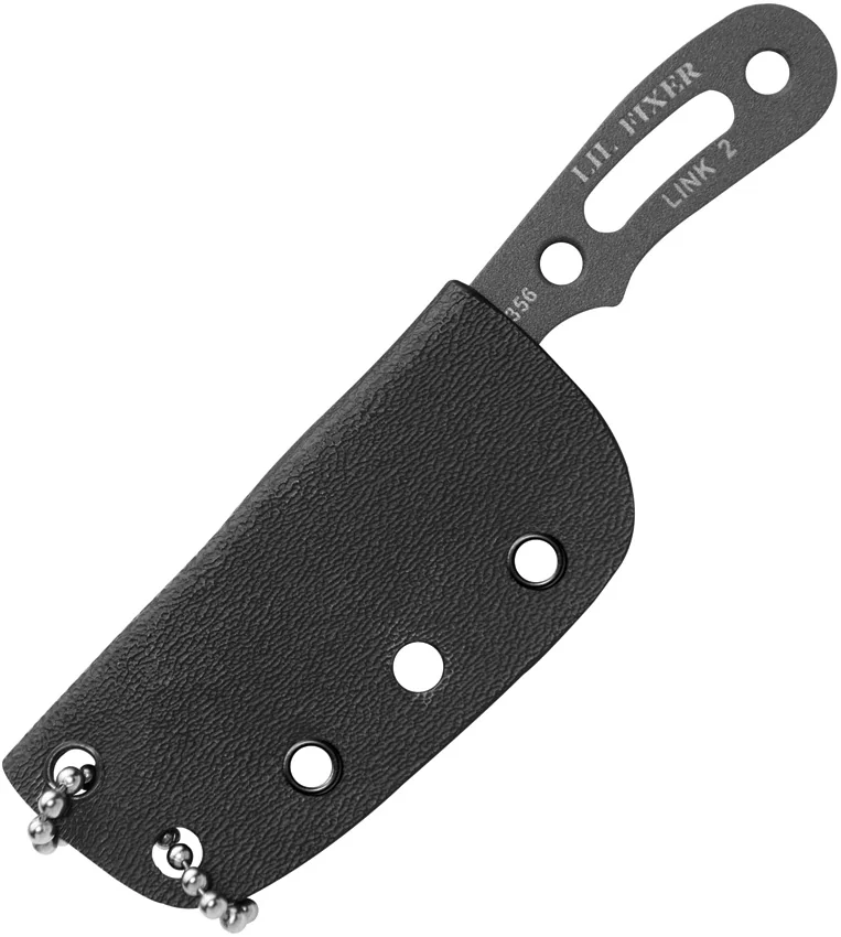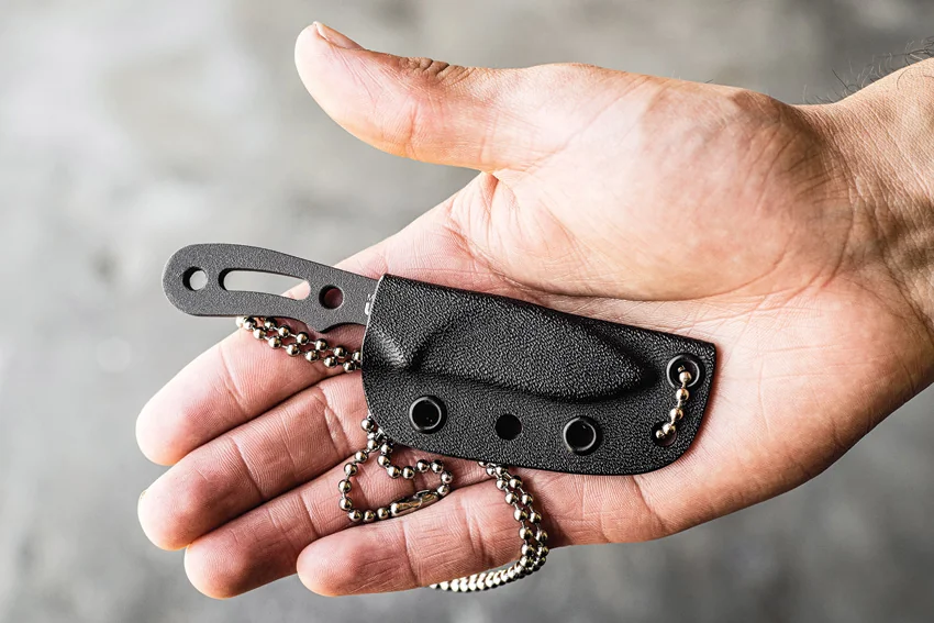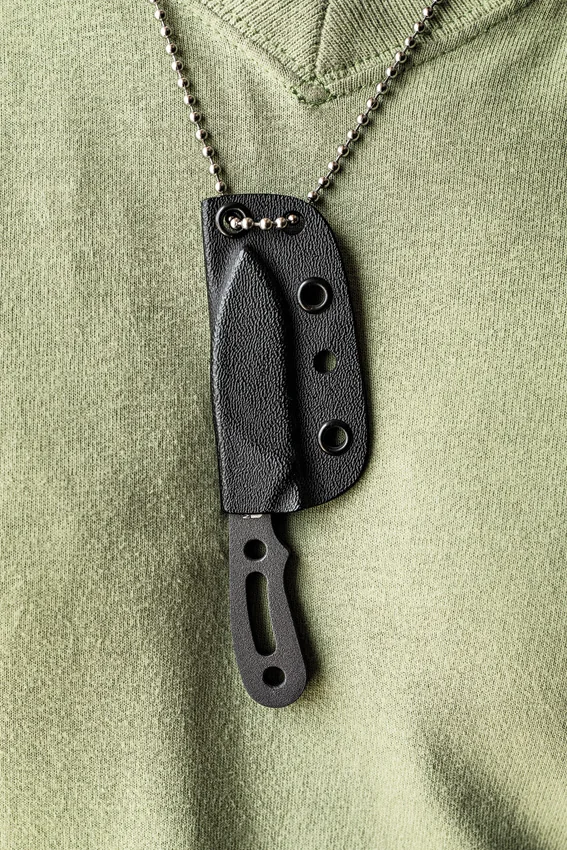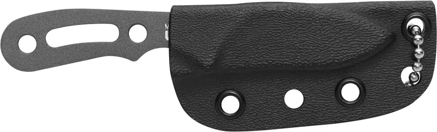 4 1/4″ overall. 1 3/4″ blade. One piece skeletonized 1095 carbon steel construction with gray tactical finish. Molded black Kydex neck sheath with beaded chain. Packaged with TOPS emergency whistle.