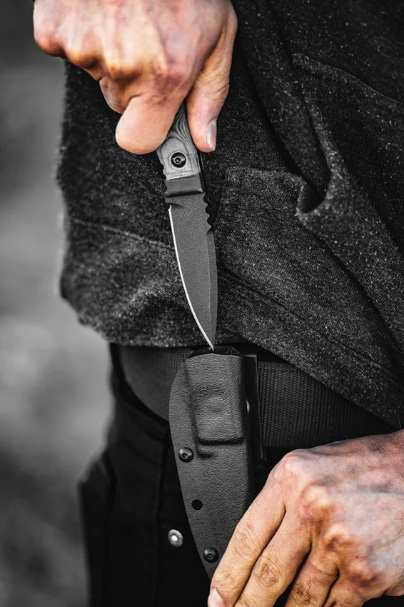 6 7/8″ overall. 3″ black traction coated 1095 high carbon steel blade. Full tang. Black linen micarta handles. Black Kydex sheath.