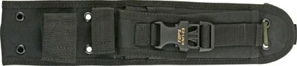 10 7/8″ overall. 5 1/2″ 1095 carbon steel blade with black traction coating. Full tang. Layered green and black G-10 handles. Black ballistic nylon belt sheath with accessory pocket and leg tie.