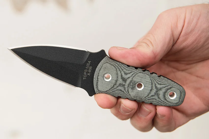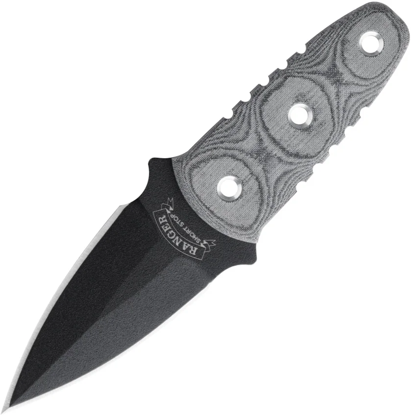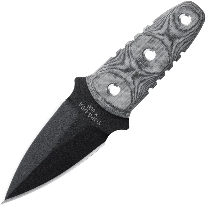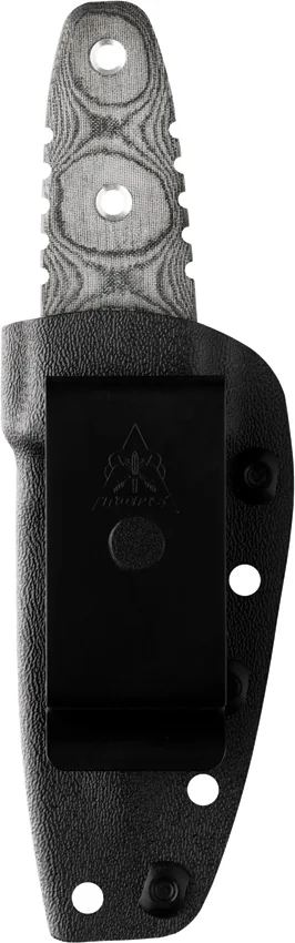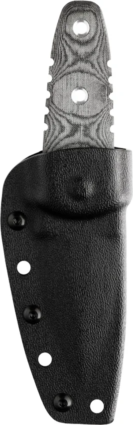6″ overall. 2 1/2″ double edged black traction coated 1095 carbon steel blade. Full tang. Black linen micarta handles. Black Kydex belt clip sheath.