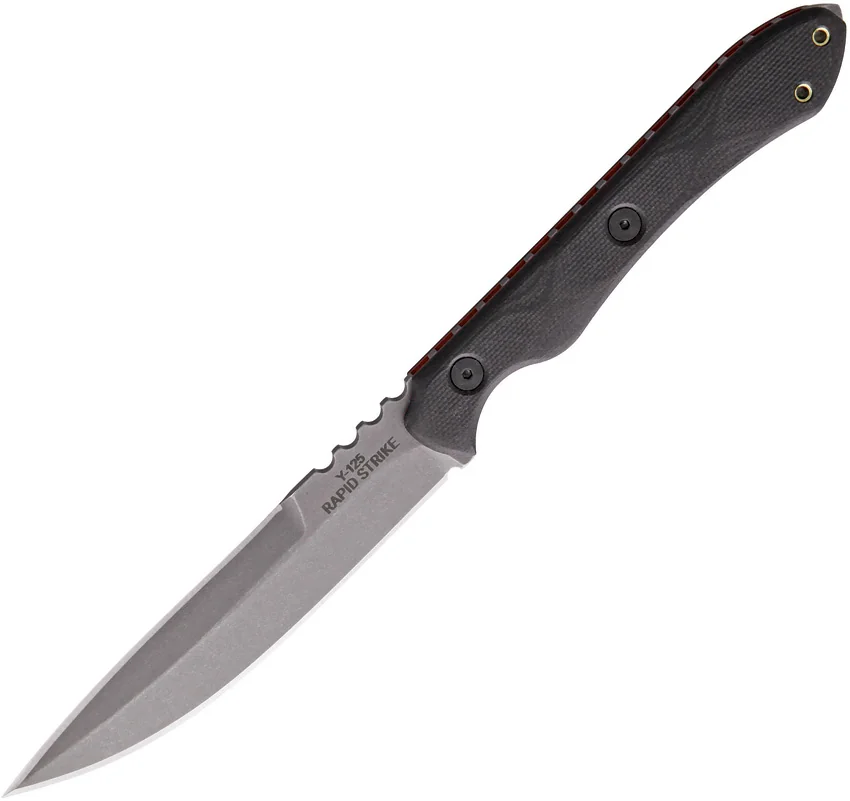 Rapid Strike. 8.5″ (21.59cm) overall. 4″ (10.16cm) tumbled finish 154CM stainless blade. Black G10 handle. Full tang. Glass breaker. Lanyard hole. Sharpened top edge. Black Kydex belt sheath. Designed by Leo Espinoza. Bulk packed.