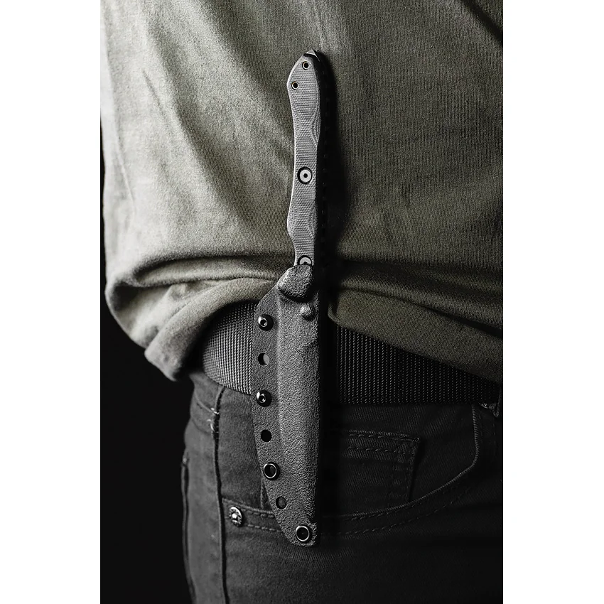 Rapid Strike. 8.5″ overall. 4″ tumbled finish 154CM stainless blade. Black G10 handle. Lanyard hole. Glass breaker. Full tang. Single edge blade. Black Kydex belt sheath. Designed by Leo Espinoza. Bulk packed.