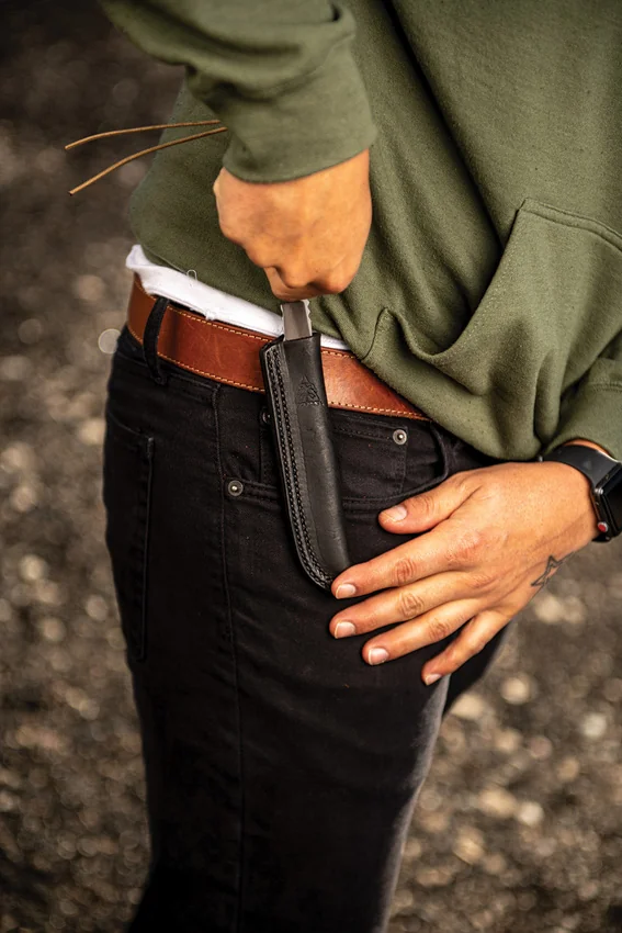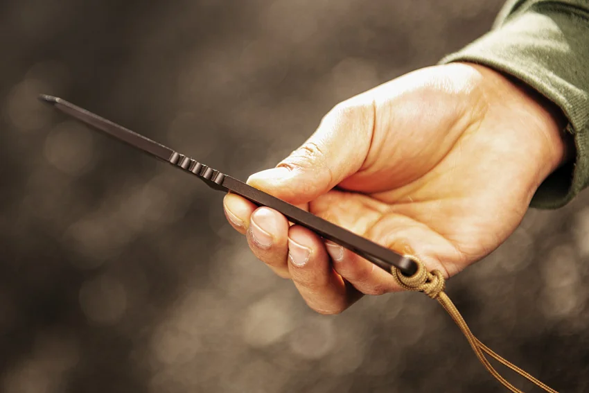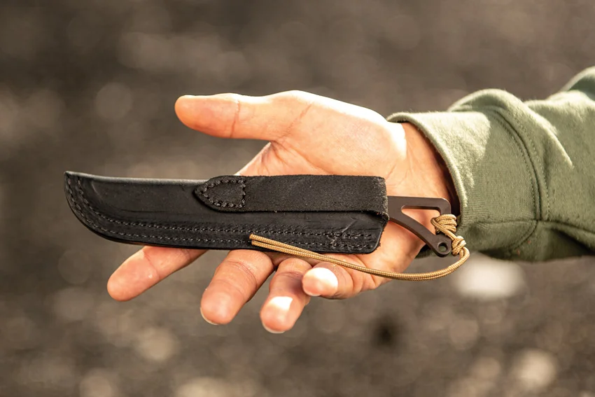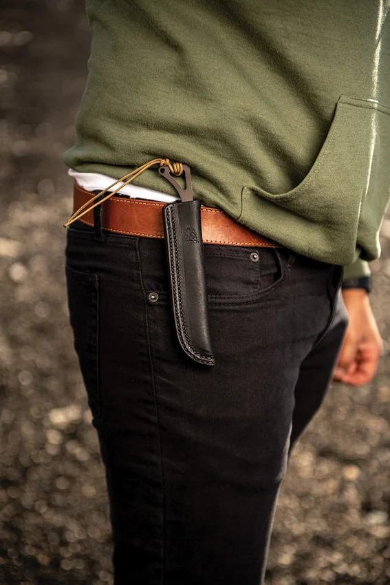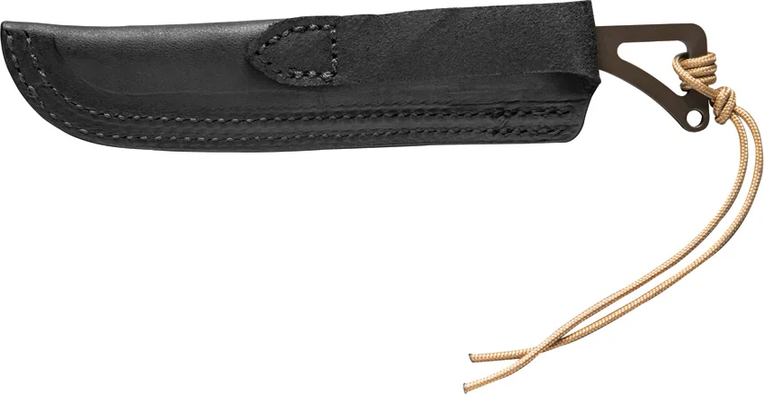 7 3/8″ overall. One piece 1095 high carbon steel construction with 3 1/2″ blade. Sandstorm Breeze finish. Skeletonized handle with cord lanyard. Black leather belt sheath. Beaded keychain with black TOPS emergency whistle. Bulk packed.