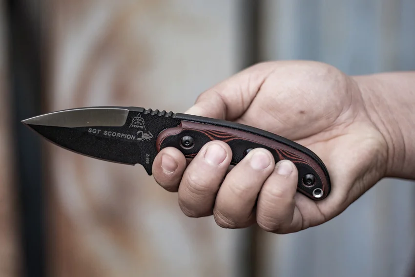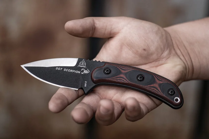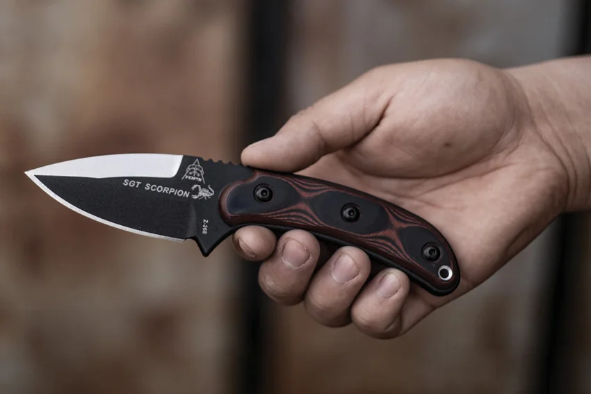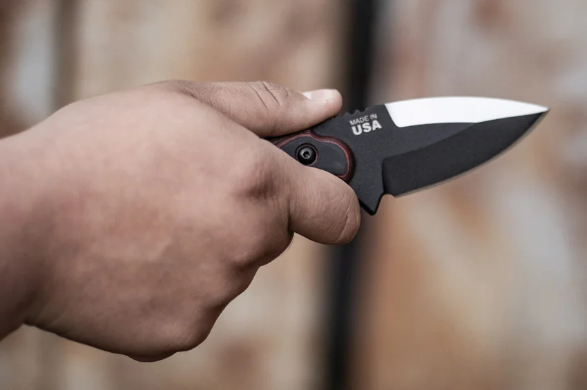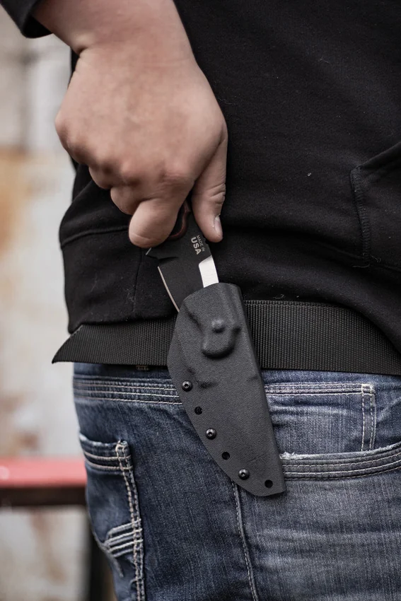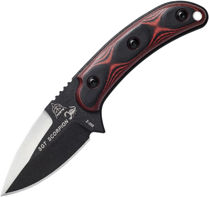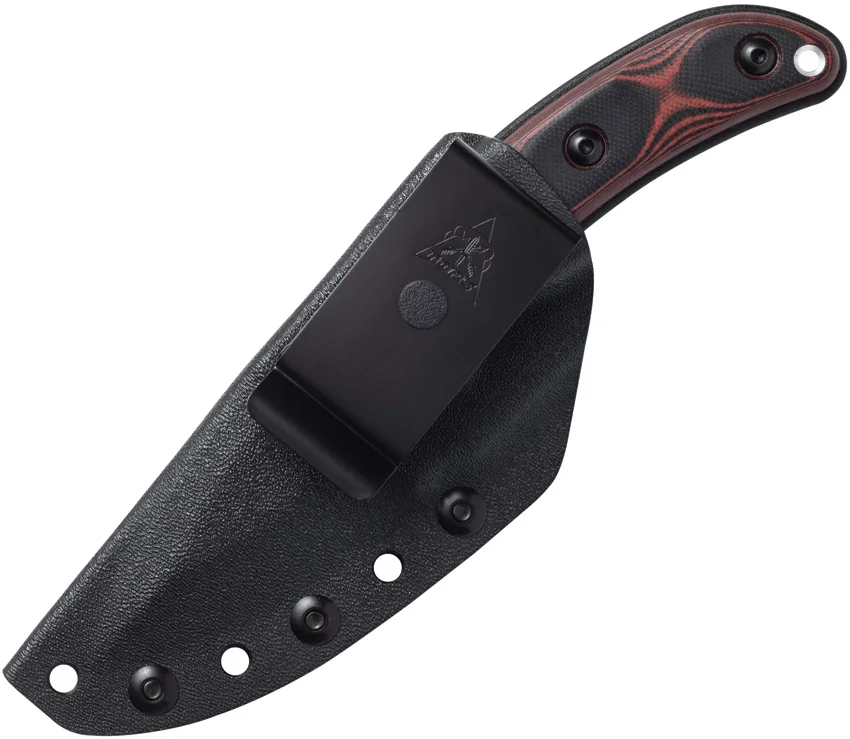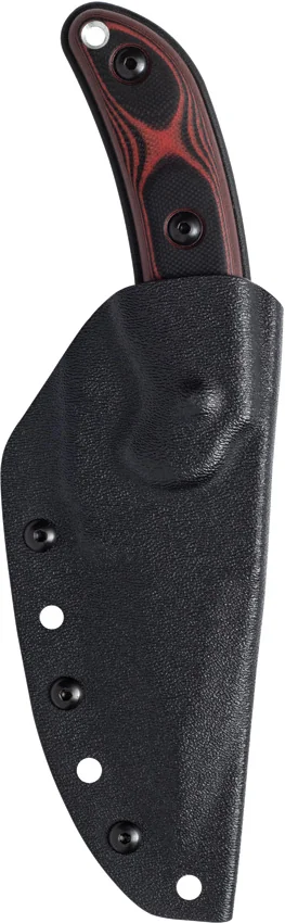 7 7/8″ overall. 3 1/4″ black traction coated 1095 carbon steel blade. Red and black micarta handles with lanyard hole. Black Kydex sheath.