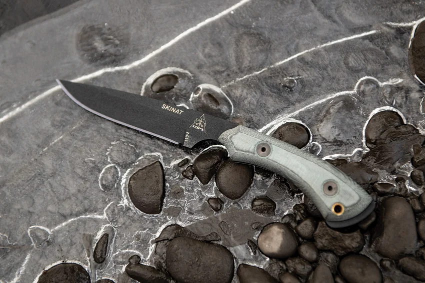 8 3/8″ overall. 3 1/2″ 1095 high carbon steel blade with black traction coating. Full tang. Black linen micarta handles. Lanyard hole. Kydex belt sheath.