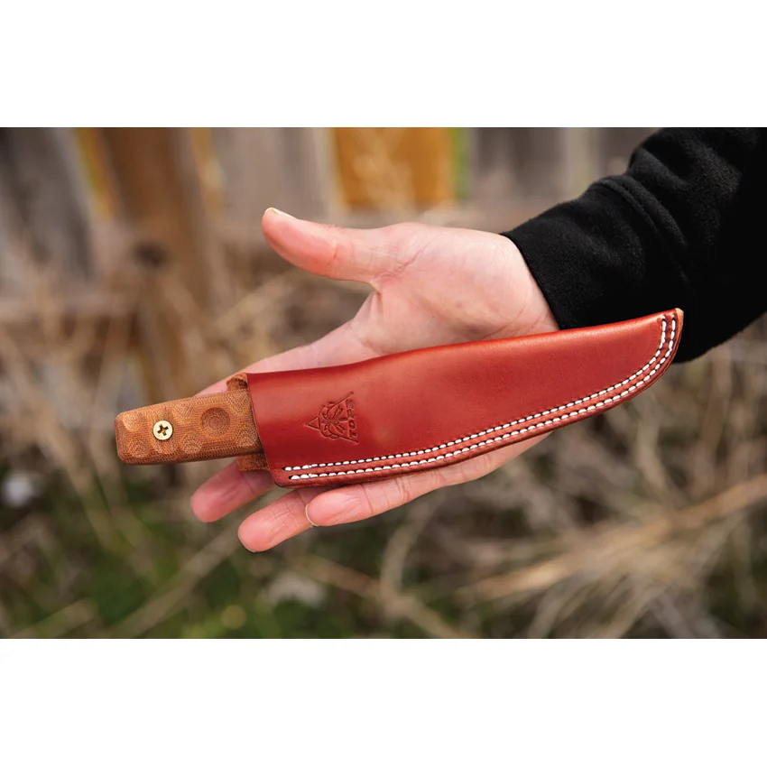 7.75″ (19.69cm) overall. 3.63″ (9.22cm) tumbled finish 1095HC steel blade. Tan canvas micarta handle. Full tang. Rocky Mountain tread handle. Dual lashing holes. Brown leather belt sheath. Bulk packed.