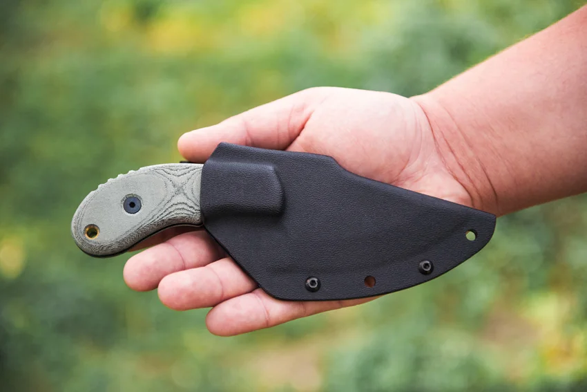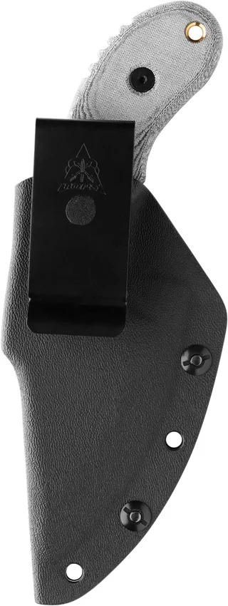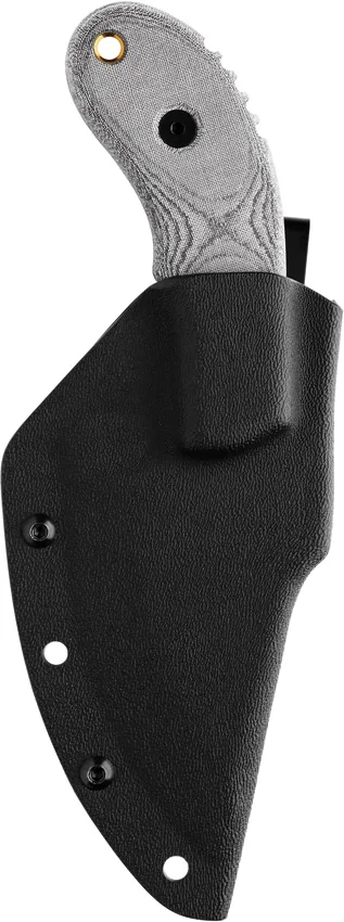 7 1/2″ overall. 3 5/8″ 1095 high carbon steel blade with black traction coating. Full tang. Black linen micarta handles. Lanyard hole. Black Kydex belt clip sheath.