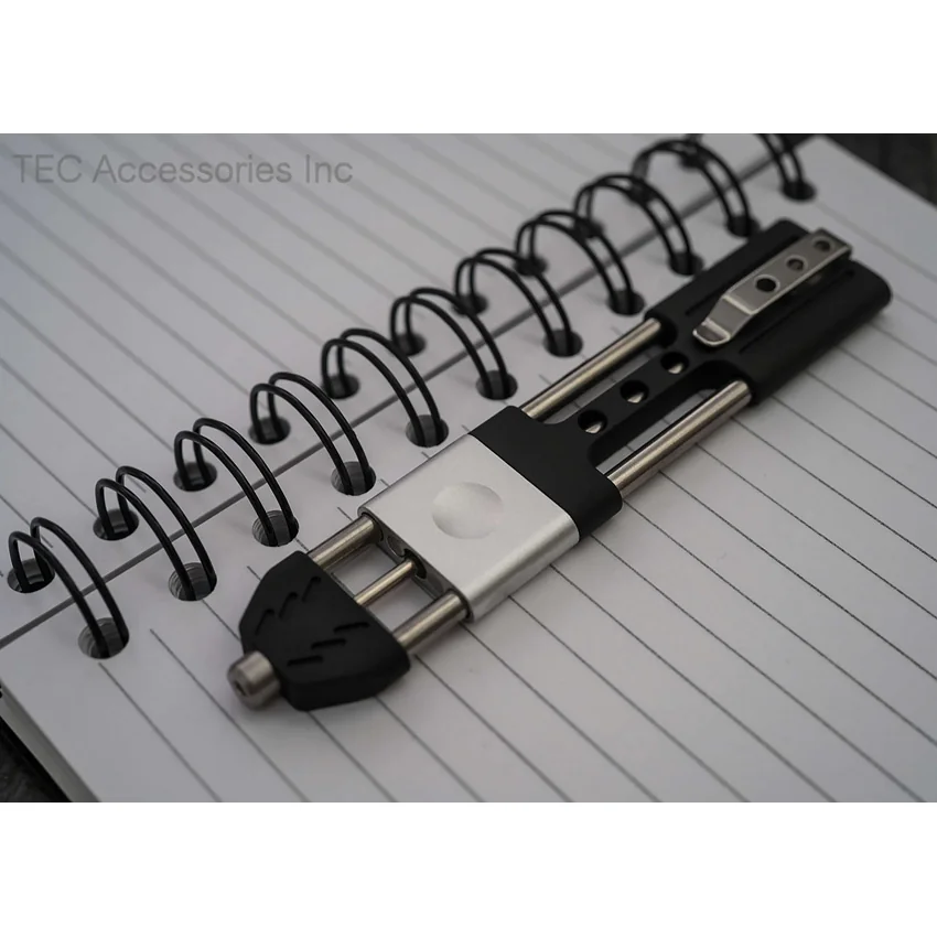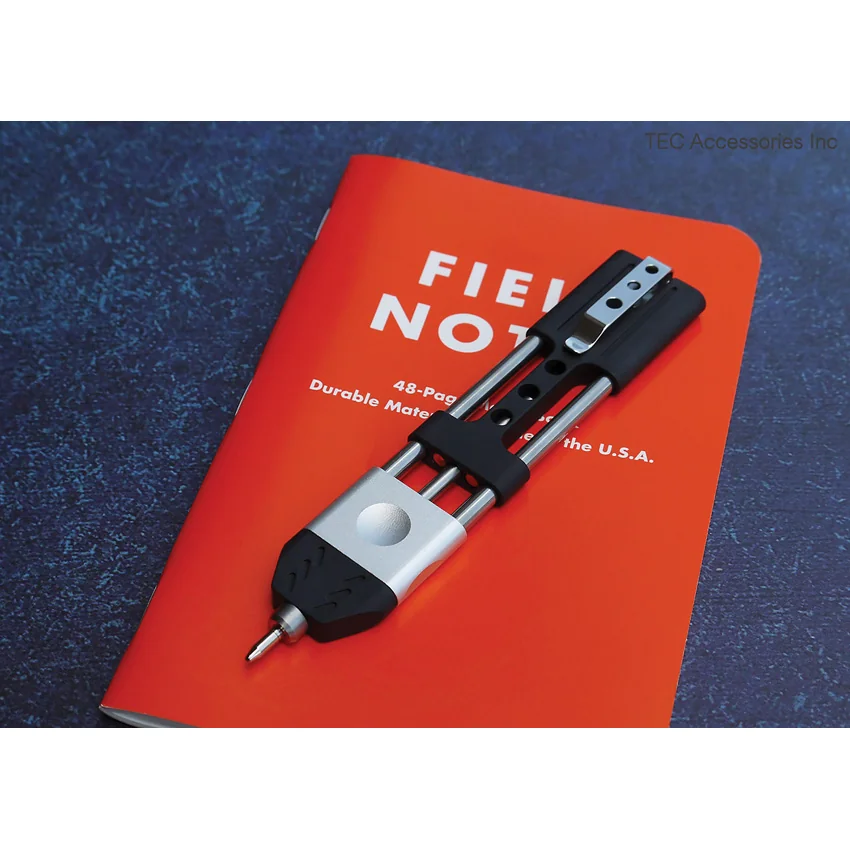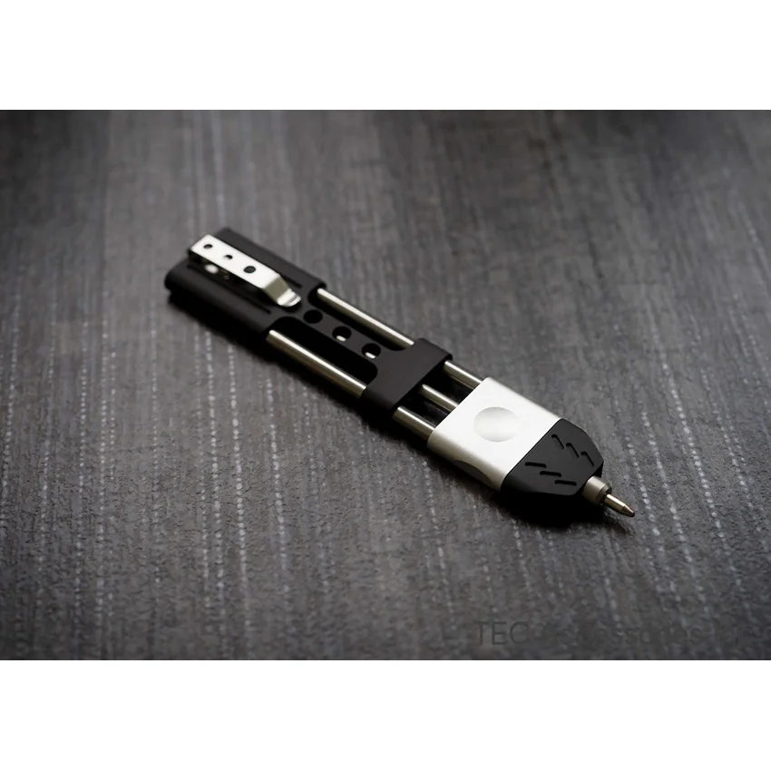 4.29″ overall. Pocket clip. Rectangular shape for writing comfort. 6mm low-profile body. Embedded micro socket provides a no hassle refill replacement that does not require tools. Compatible with common D1 “multi-pen” (TEC02, TEC03), Fisher Space Pen (FP171112, FP171211, FP171419), and Rite in the Rain (RITR37R) refills. No possibility of accidental ink retraction during use. Anti-roll design. Assembled from 24 individual, custom machined components. Black finish aluminum body with stainless guide rails. Boxed.