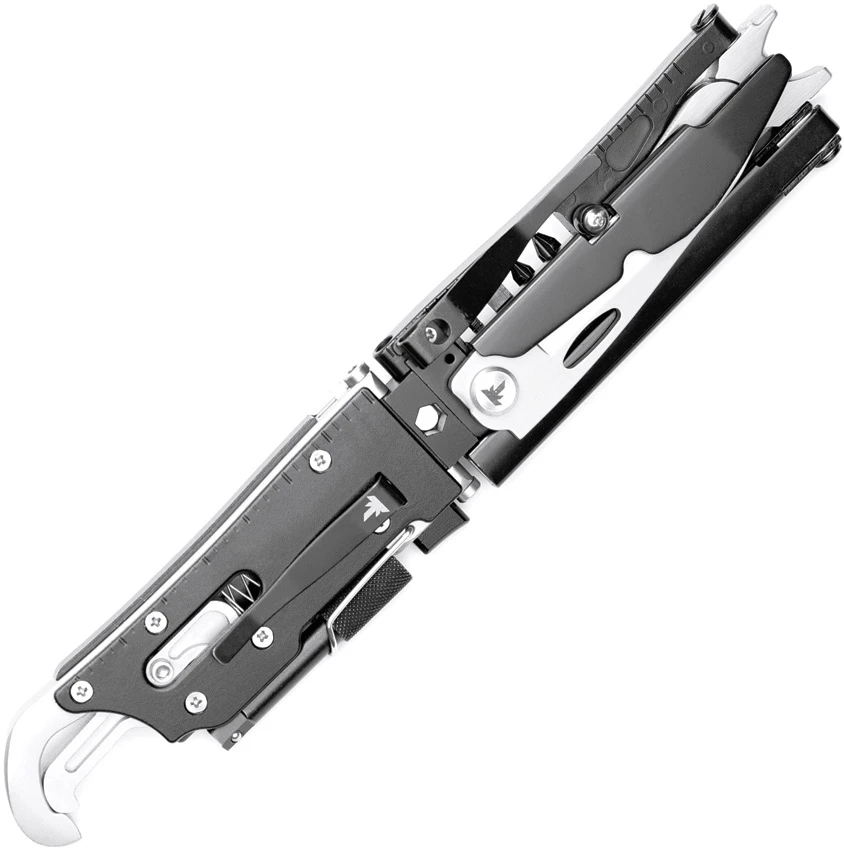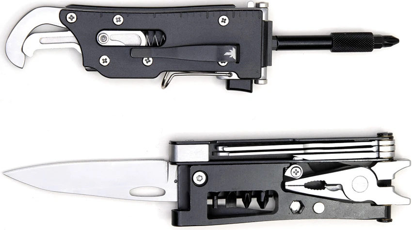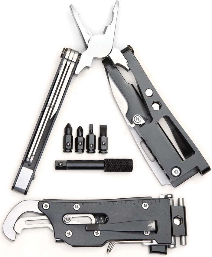 Tools include: Pliers l Wire cutter l Saw blade l Awl l Reamer l File. OMNILOCK Ratcheting, Self Adjusting Wrench. Lockable D2 tool steel blade. D2 tool steel metal saw blade. Locking handle for pistol grip saw action. Bit extender. Low-Profile Bit Driver Set with Standard Flat, #1 Phillips, #2 Phillips, 3/32 Hex. Boxed.