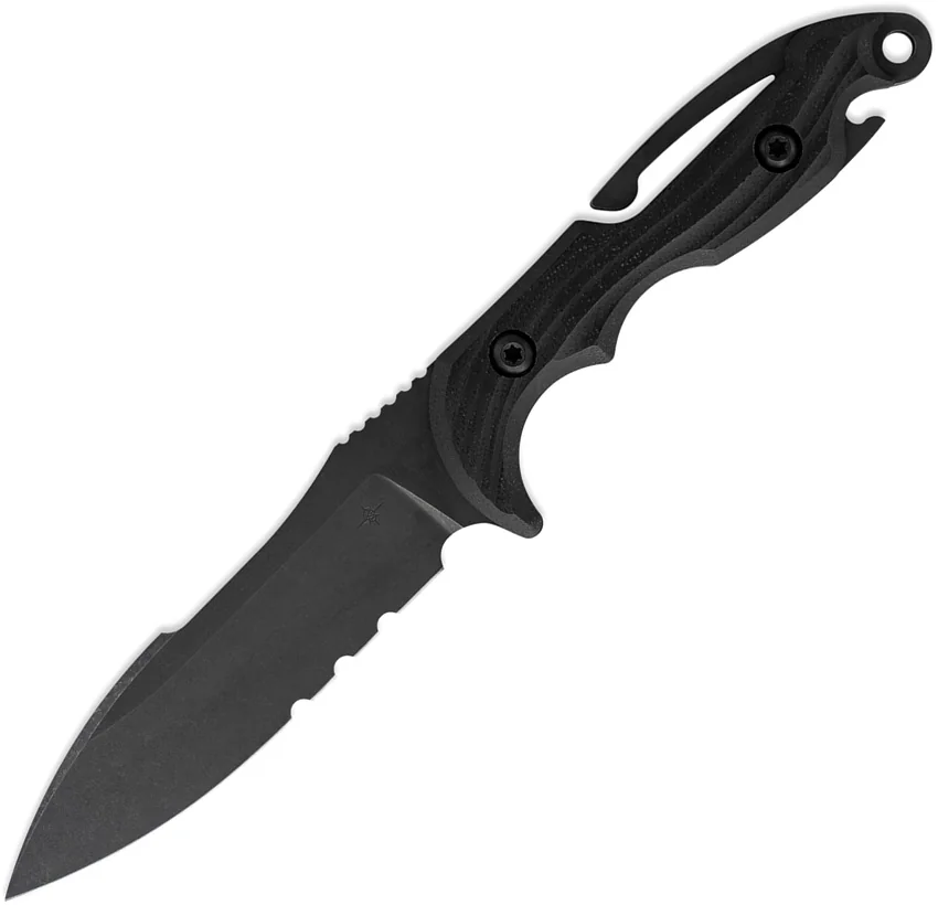 8.75″ (22.23cm) overall. 4.25″ (10.8cm) black oxide coated partially serrated CPM S35VN stainless spear point blade. Lanyard hole. Full, extended tang. Black G10 and carbon fiber handle. Integrated spine clip. This Item may only be EXPORTED. It may NOT be sold to customers within the United States. Black Kydex belt sheath. Boxed.