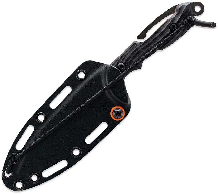 8.75″ (22.23cm) overall. 4.25″ (10.8cm) black oxide coated partially serrated CPM Cru-Wear steel spear point blade. Black sculpted G10 handle. Full, extended tang. Lanyard hole. Orange liners. Integrated spine clip. This Item may only be EXPORTED. It may NOT be sold to customers within the United States. Black Kydex belt sheath. Boxed.
