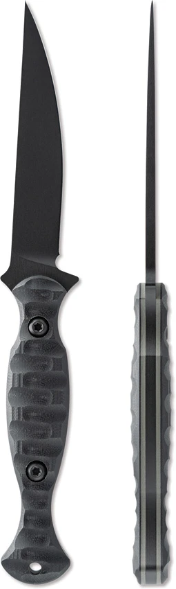 8.63″ (21.92cm) overall. 4.25″ (10.8cm) Gun-Kote finish CPM-M4 stainless blade. Black sculpted G10 handle. Full tang. Lanyard hole. Socom black blade. Black Kydex belt sheath. Boxed.